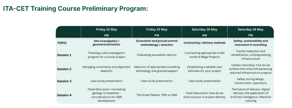 The ITACET training course at WTC 2026 in Montreal will be held on 15 and 16 May 2026 and promises to be an inspiring event, focusing on ‘Planning and contracting for sustainable tunnels’.